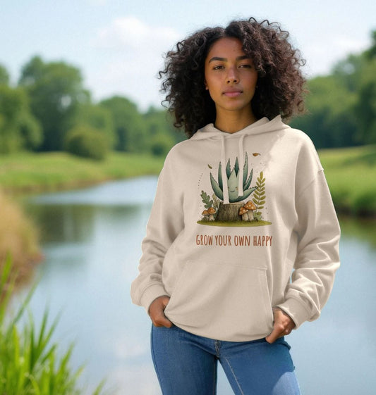 “Grow Your Own Happy” – Organic Cotton Hoodie with Smiling Plant & Mushrooms Design
